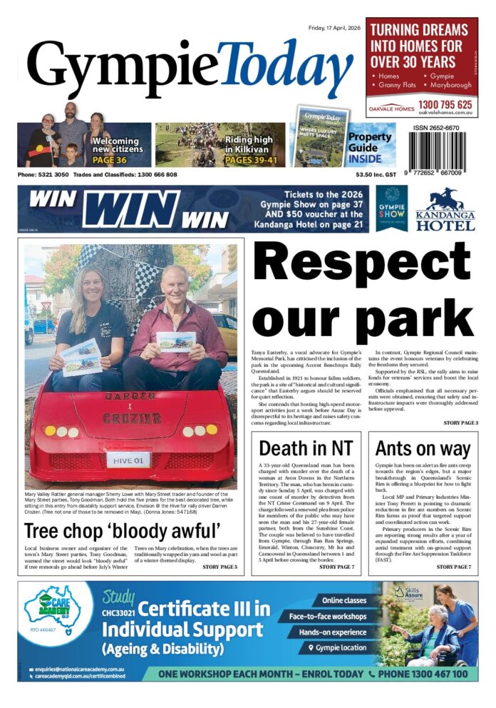 Gympie Today – 17th April 2026 Subscribe or Login to see the rest of the content. Username Password * Remember Me Forgot Password News Burnback on tiny terror as ants march closer 17/04/2026 Gympie has been on alert as fire ants creep towards the region’s edges, but a major breakthrough in Queensland’s Scenic Rim is offering a... Decorated … then doomed! 17/04/2026 Mary Street’s trees are already stealing the show as a colourful drawcard for this week’s Wheels on Mary event, even as three face the... Gympie girls lead the pack at Murgon 17/04/2026 The 2026 South Burnett and Gympie District Ladies golf events kicked off on Friday, 10 March, with Murgon Golf Club hosting the first round...