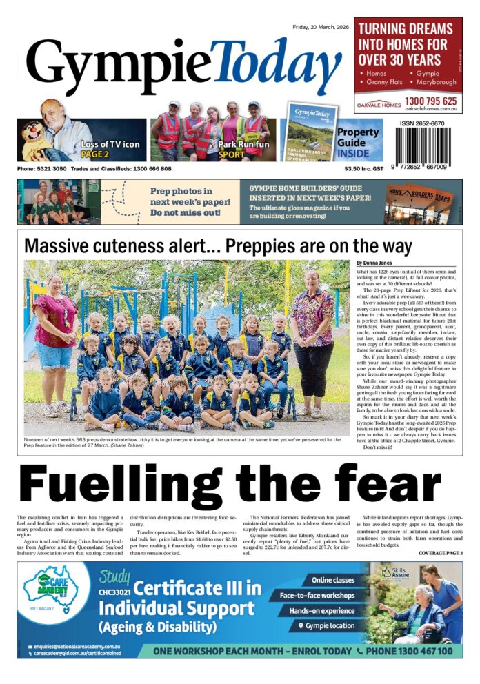 Gympie Today – 20th March 2026 Subscribe or Login to see the rest of the content. Username Password * Remember Me Forgot Password News Great way to mark birthday 20/03/2026 The Cooloola Coast Bowls Club hax had an exciting week, hosting an 80th birthday and the week’s games. On Saturday, 14 March, the mixed pairs... Goomeri Show is postponed 20/03/2026 Goomeri Show is the second Burnett show society to postpone their agricultural show. Heavy rains and widespread flooding over the weekend of 7 to... A real boot-scootin’ rave 20/03/2026 It was a rave of a time as locals packed into the Pavilion on Saturday night, 14 March, for the Giddy Up Gympie Country...