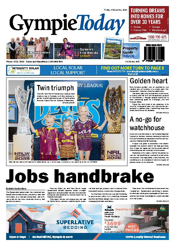 Gympie Today – 5th December 2025 Subscribe or Login to see the rest of the content. Username Password * Remember Me Forgot Password News Gympie’s everyday angels 05/12/2025 One Gympie resident was so touched by two random acts of kindness in a single week that she couldn’t help but share her good... Gympie relief team cater Nanango awards night 05/12/2025 The Gympie Rapid Relief Team (RRT) were the caterer for the State Emergency Service (SES) as it held an awards night in Nanango recently... History research group to celebrate their own milestone 05/12/2025 As the 2025 year draws to a close, one society in the district has reached its 45th birthday, and this weekend is celebrating with...