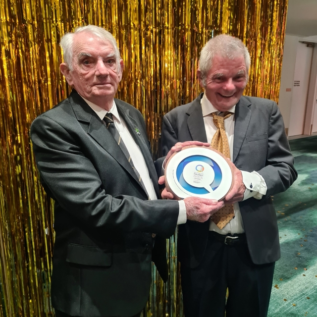 Rattler volunteers Pat Lourigan and Joe Kiernan had no trouble seeing the positives, as they were presented with the Rattler's big win in the Queensland Tourism Awards. (Supplied 509629_01)