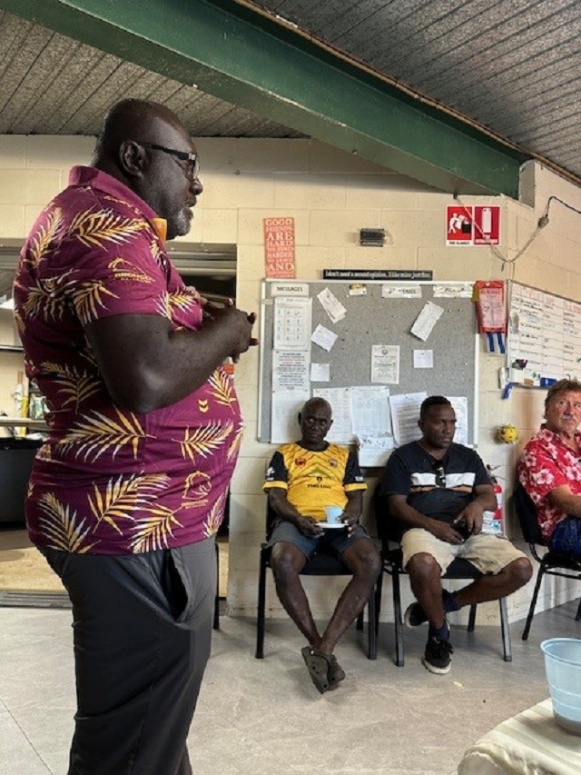 The Honorable Tozen Leokana, Minister for Education in the Solomon Islands, thanks the volunteers at Little Haven Marketplace for donating surplus clothing and bric-a-brac to communities in need in the Solomons. (Supplied)