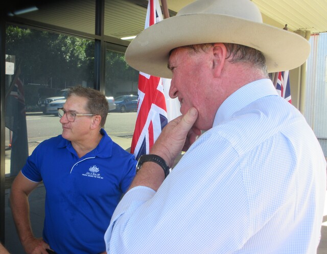 Barnaby Joyce, with Llew O'Brien, talks with veterans in Gympie. (473614_01)