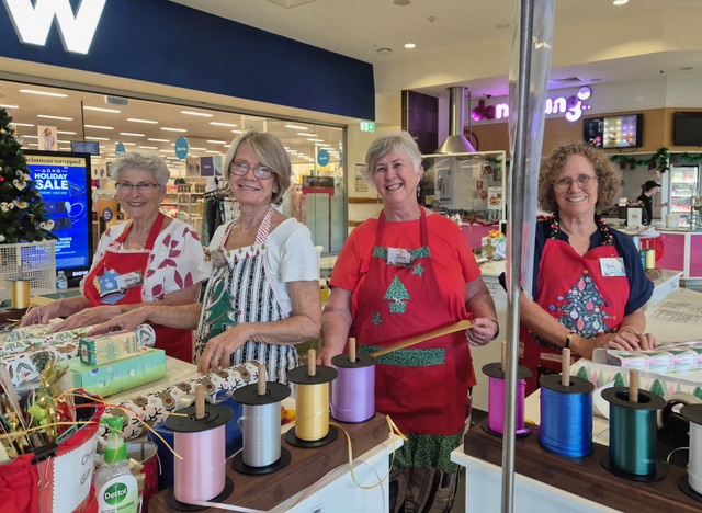 Volunteer members of the Happy Wrappers, Shirley, Marie, Ruth and Beth put their wrapping skills to the test, gift wrapping Christmas presents to raise money for both Little Haven Palliative Care and the Gympie Community Bus. (Supplied)