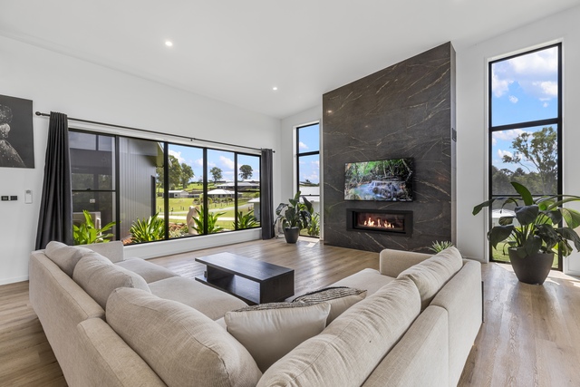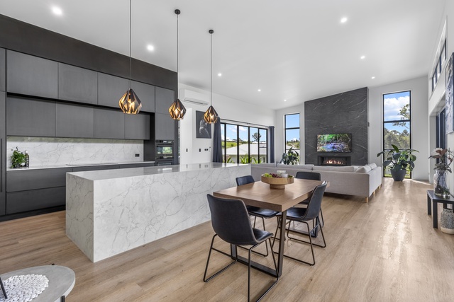 Inside, home opens into a spacious, light-filled layout where luxury meets everyday functionality. High ceilings and large glazed windows draw in natural light and cooling breezes, enhancing the sense of space throughout. At the heart of the home, the beautifully appointed kitchen showcases granite waterfall benchtops and a seamless connection to the warmth of a gas feature fireplace, creating a central hub that is both inviting and impressive. The butler’s pantry has been cleverly designed for practicality without compromising on style, while elegant pendant lighting above the island bench completes the space.