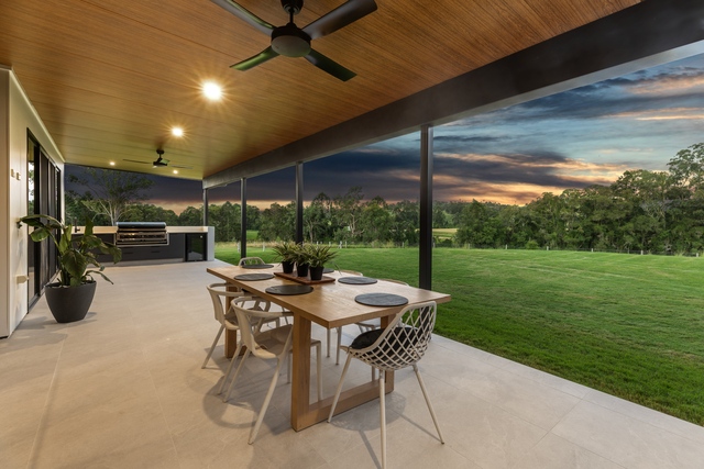 The dining area flows effortlessly to the outdoor entertaining zone, where a covered alfresco area with built-in BBQ overlooks peaceful neighbouring farmland—an ideal setting for relaxed evenings and weekend gatherings. Privacy has been carefully considered in the positioning and layout of the home, allowing you to fully enjoy the tranquil surrounds while still embracing the outlook across the countryside.