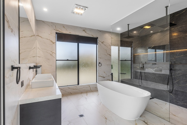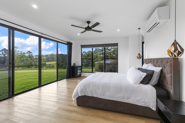 The master suite is privately located and designed as a true retreat, capturing scenic views and complemented by a spacious ensuite featuring a double shower and full-sized bath. The walk-in robe offers generous storage with dedicated space for both his and hers.