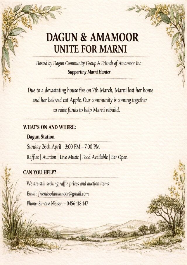 Hosted by Dagun Community Group and Friends of Amamoor Inc, Dagun and Amamoor Unite for Marni will be held at Dagun Station on Sunday 26 April from 3pm to 7pm.