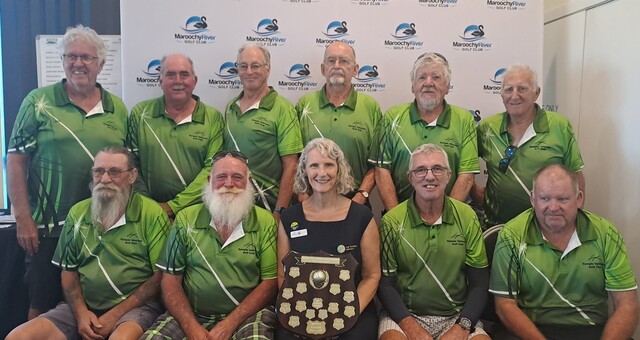 The winning Gympie team were (back from left) Max Tompkins, Glenn Irwin, Scott Sommerville, Tim Coogan, Ken Wilkins and Greg Mitchell, and (front) Geoff Barling, Ian Barling, the sponsor representative, Peter Ovens and Glen Fallon, who brought the district trophy back to Gympie last week. (Supplied)